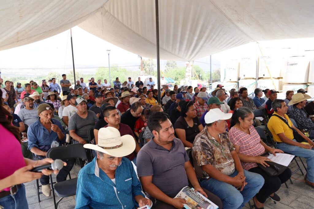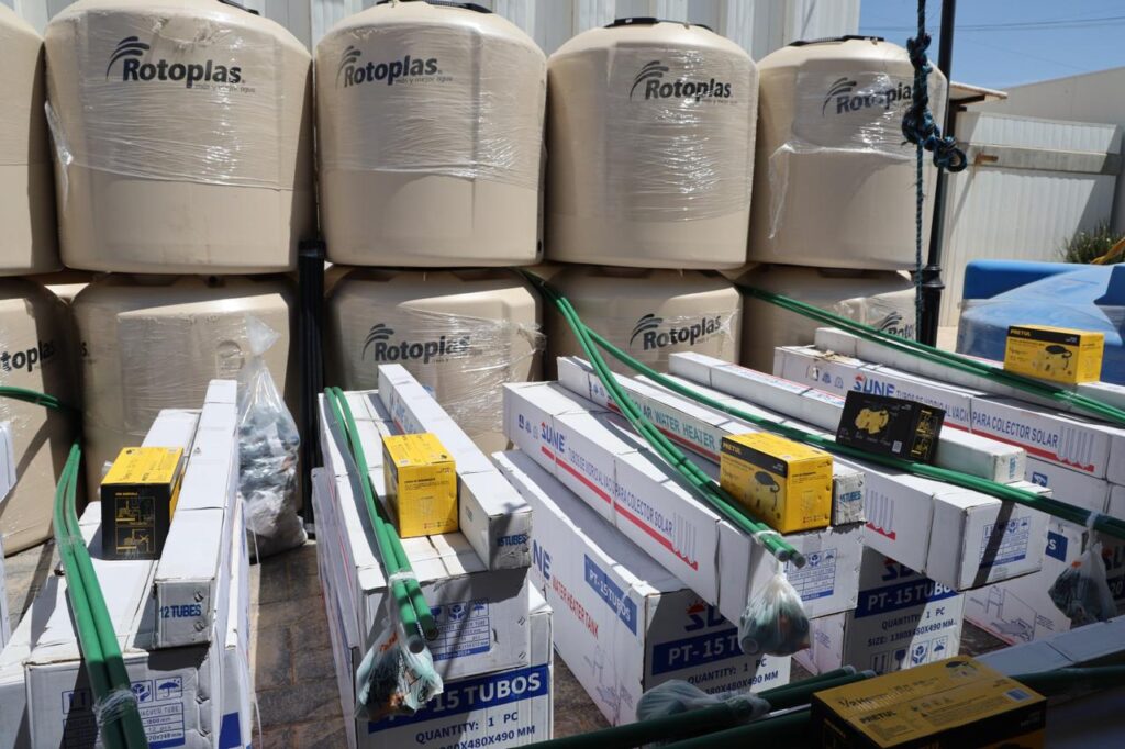 Acompañado de regidores y funcionarios de su gabinete, Gaspar Trueba entregó depósitos para almacenar agua potable, tejas para cubrir los techos de las viviendas, carretillas, picos, palas, equipos para w.c. y calentadores solares.