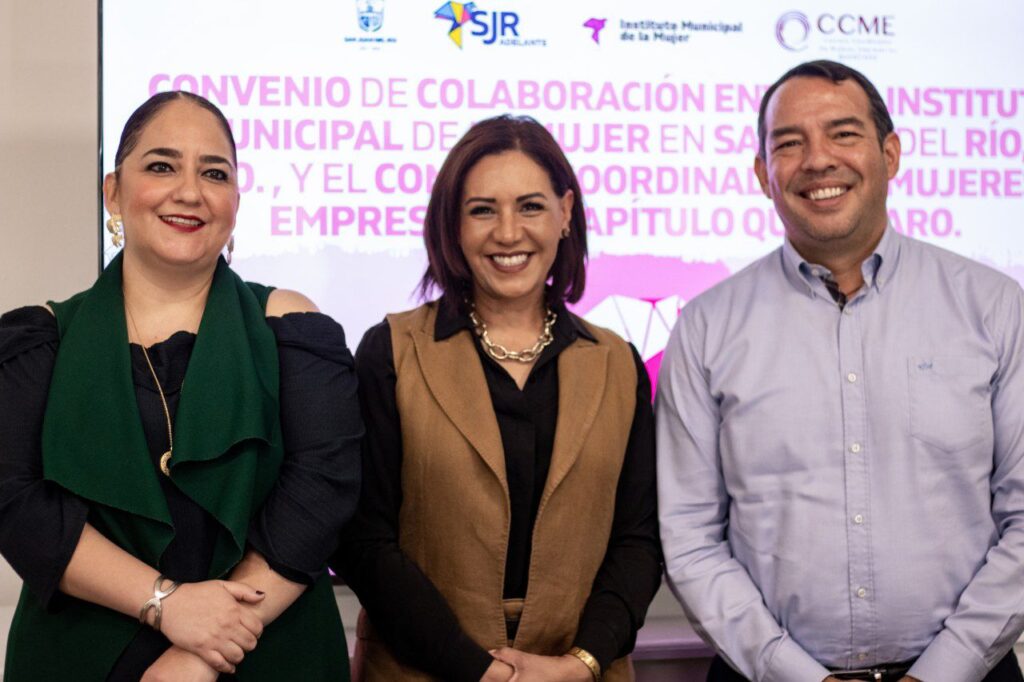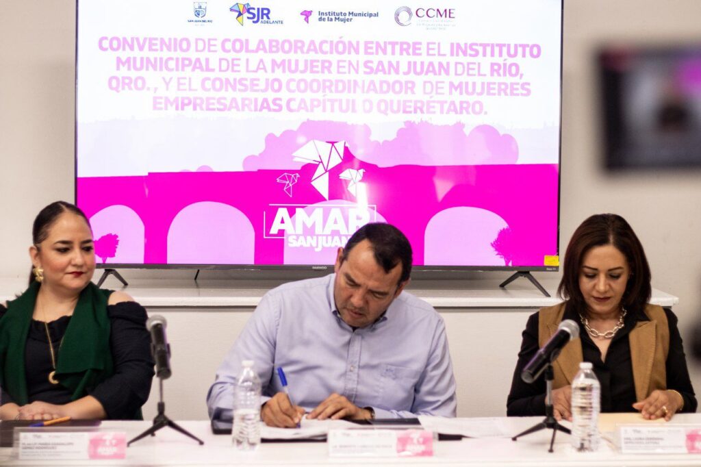 Con el objetivo de mejorar la economía de las mujeres y fomentar su crecimiento en diversas actividades financieras relacionadas con la innovación, autoempleo y emprendimiento, se llevó a cabo la firma de convenio entre el Gobierno Municipal de San Juan del Río, encabezado por Roberto Cabrera Valencia, a través del Instituto Municipal de la Mujer (IMM), dirigido por María Guadalupe Gómez Rodríguez y el Consejo Coordinador de Mujeres Empresarias Capítulo Queretaro.