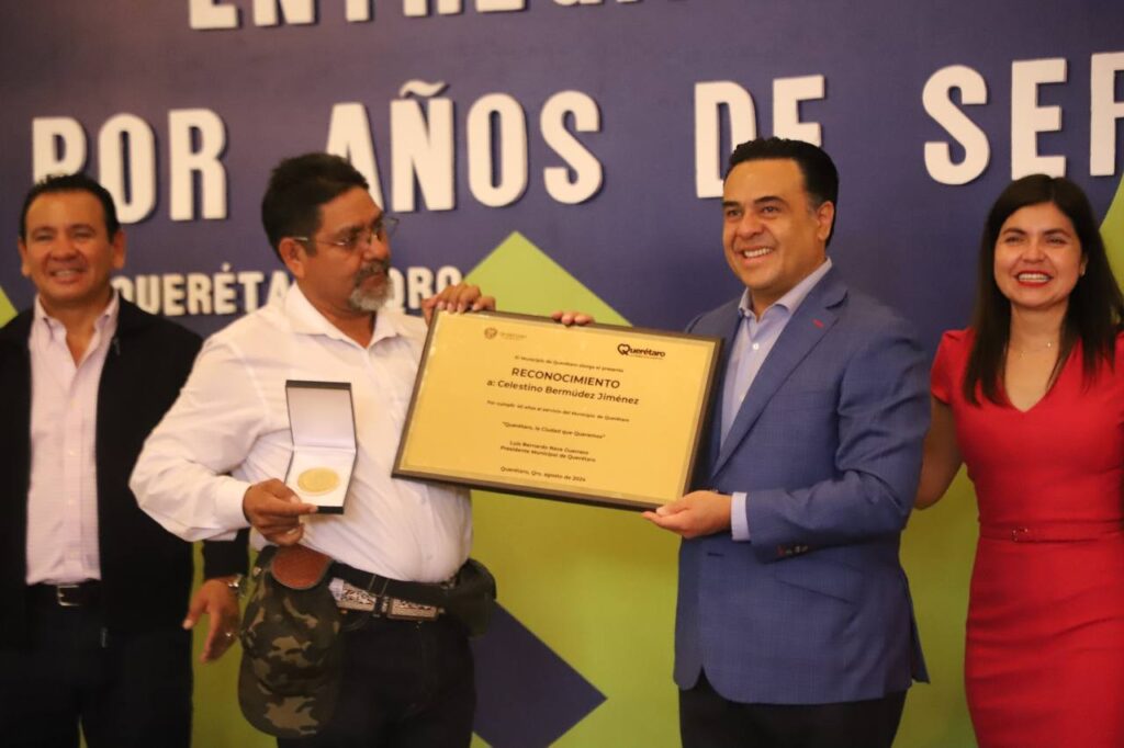 Celestino Bermúdez Jiménez, Secretario General del Sindicato de Trabajadores al Servicio del Municipio de Querétaro, y que también cumplió 40 años de labores, reconoció los retos que se enfrentan a diario los trabajadores municipales, pero que su dedicación y compromiso son fundamentales para seguir adelante, de ahí que llamó a reafirmar su lealtad al Municipio y su disposición para continuar trabajando por la ciudad.
