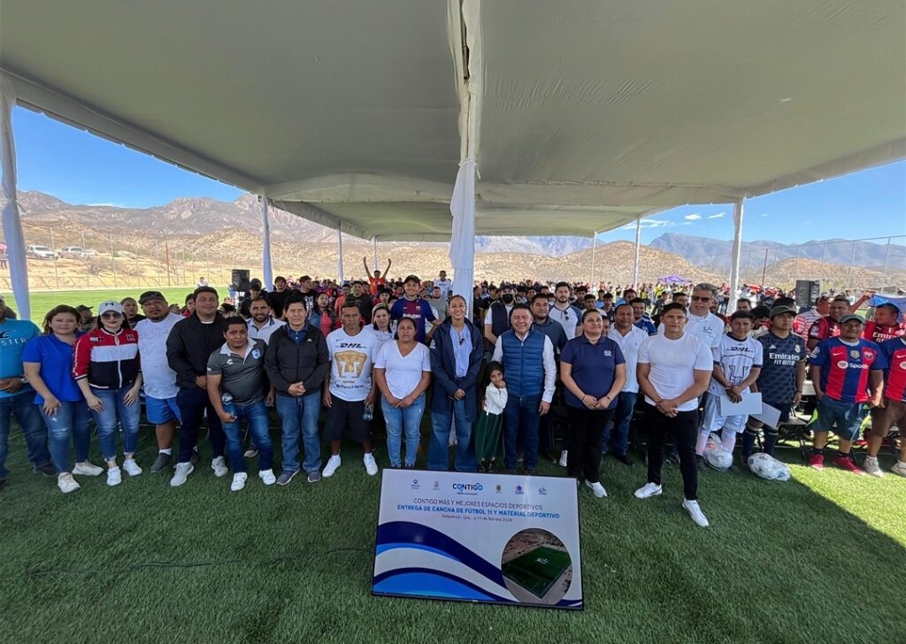 La directora general del Instituto del Deporte y la Recreación del Estado de Querétaro (INDEREQ), Iridia Salazar Blanco, encabezó la entrega de material deportivo y la nueva infraestructura de la cancha de fútbol 11 en la comunidad de El Sauz, en el municipio de Peñamiller.