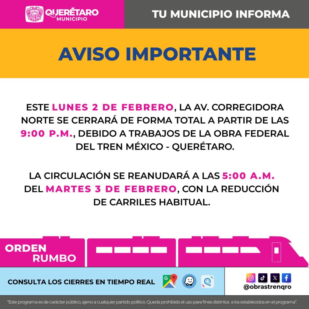 El Municipio de Querétaro informa a la ciudadanía que, este lunes 2 de febrero, el cierre total de Av. Corregidora Norte iniciará a las 21:00 horas, debido a trabajos realizados por el Gobierno Federal, derivados de la obra del Tren México–Querétaro.