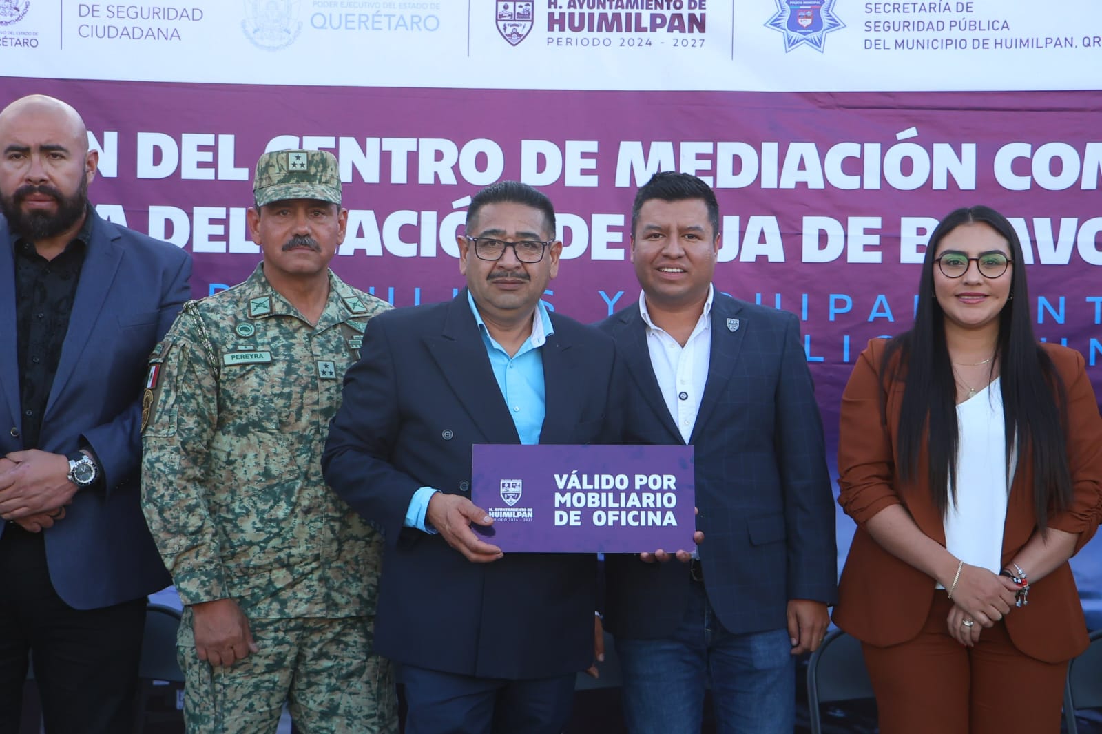 Como parte de una estrategia integral para fortalecer la seguridad pública y promover la convivencia social, el municipio de Huimilpan llevó a cabo la inauguración del Centro de Mediación Comunitaria en la Delegación de Ceja de Bravo, así como la entrega de patrullas, equipamiento, mobiliario y herramientas operativas a la Secretaría de Seguridad Pública Municipal.