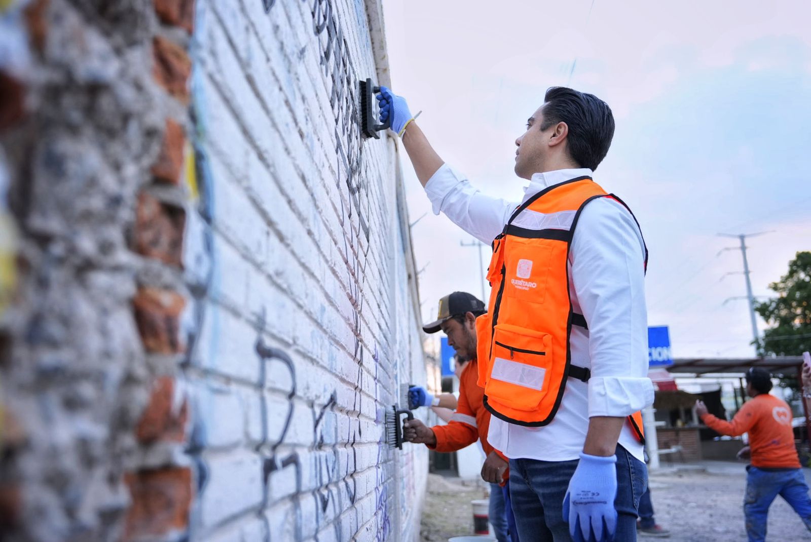 Para mantener una ciudad limpia y ordenada, el presidente municipal de Querétaro, Felifer Macías, lideró las labores de limpieza de grafiti y pintura de la barda perimetral en la Unidad Deportiva José María Truchuelo, donde participaron vecinos de la zona y una cuadrilla del personal de la Secretaría de Servicios Públicos Municipales que unieron esfuerzos para mejorar el entorno.
