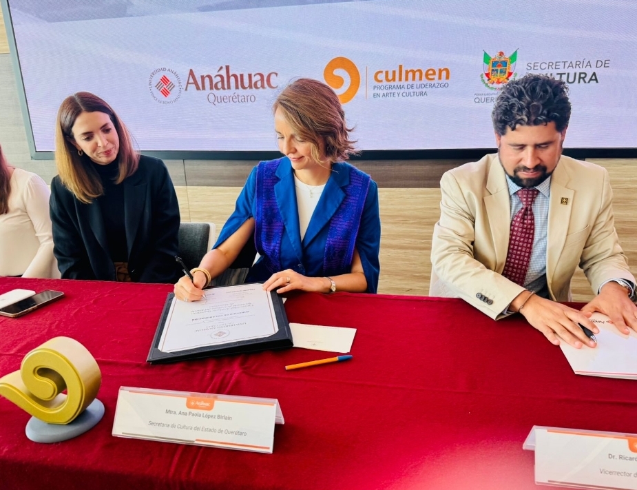 La secretaria de Cultura del estado, Ana Paola López Birlain, y el vicerrector de Formación Integral de la Universidad Anáhuac Querétaro, Ricardo Virués Macías, firmaron un convenio de colaboración con el propósito de fortalecer la investigación, la formación continua, la vinculación interinstitucional y la creación de proyectos que beneficien a ambas instituciones, instrumento que representa un paso decisivo hacia una entidad donde la educación, la ciencia, la tecnología y la cultura trabajan de la mano como un solo ecosistema.