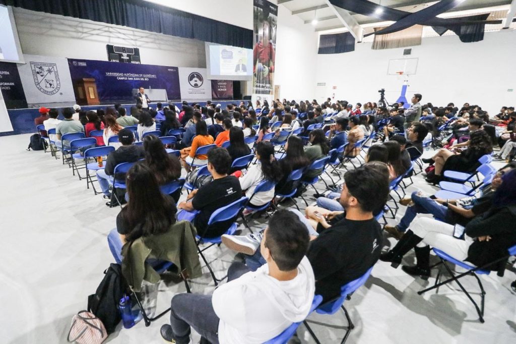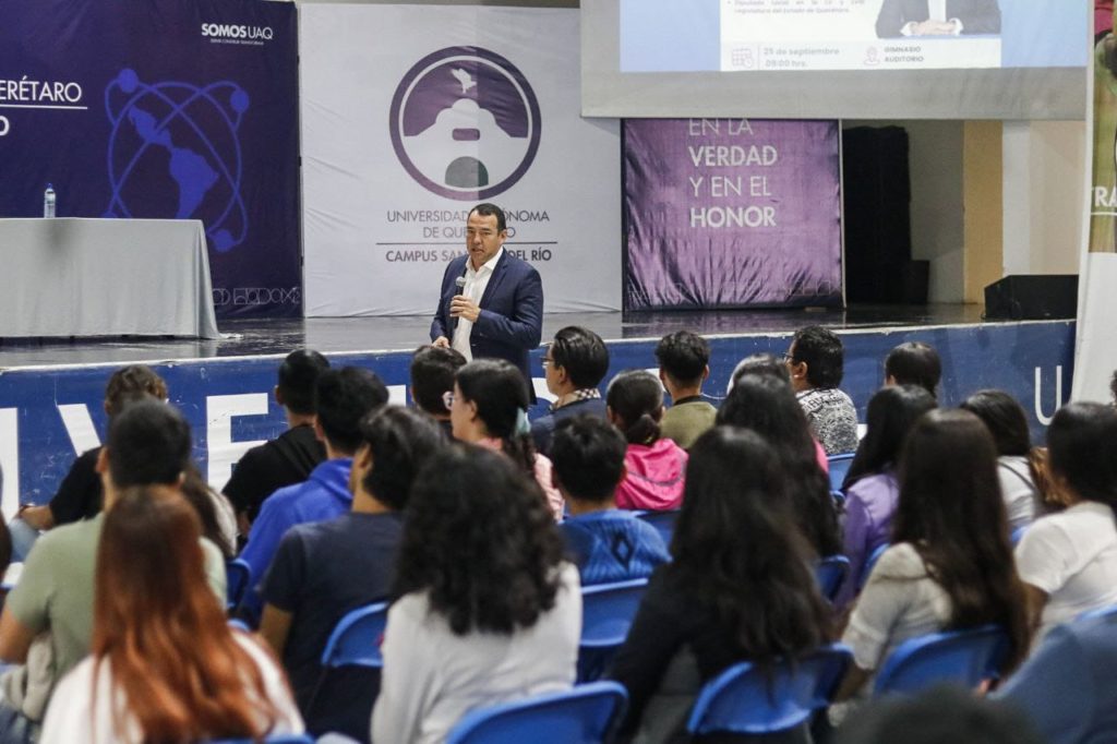 Roberto Cabrera reiteró a la comunidad estudiantil reunida en el Gimnasio Auditorio que la economía del municipio de San Juan del Río se basa en los sectores agropecuario, industrial y de servicios. Agregó que la demarcación es la Puerta del Bajío, una región que participa activamente en la economía nacional.