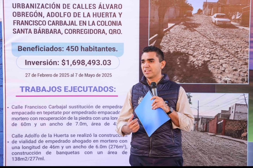 El Jefe de Gabinete Municipal de Corregidora, Carlos Contreras, en representación del alcalde Chepe Guerrero, entregó la obra de urbanización de las calles Adolfo de la Huerta, Francisco Carbajal y Adolfo Ruiz Cortines en la colonia Santa Bárbara, la cual beneficia a más de 450 habitantes de la zona gracias a una inversión de 2.3 millones de pesos.