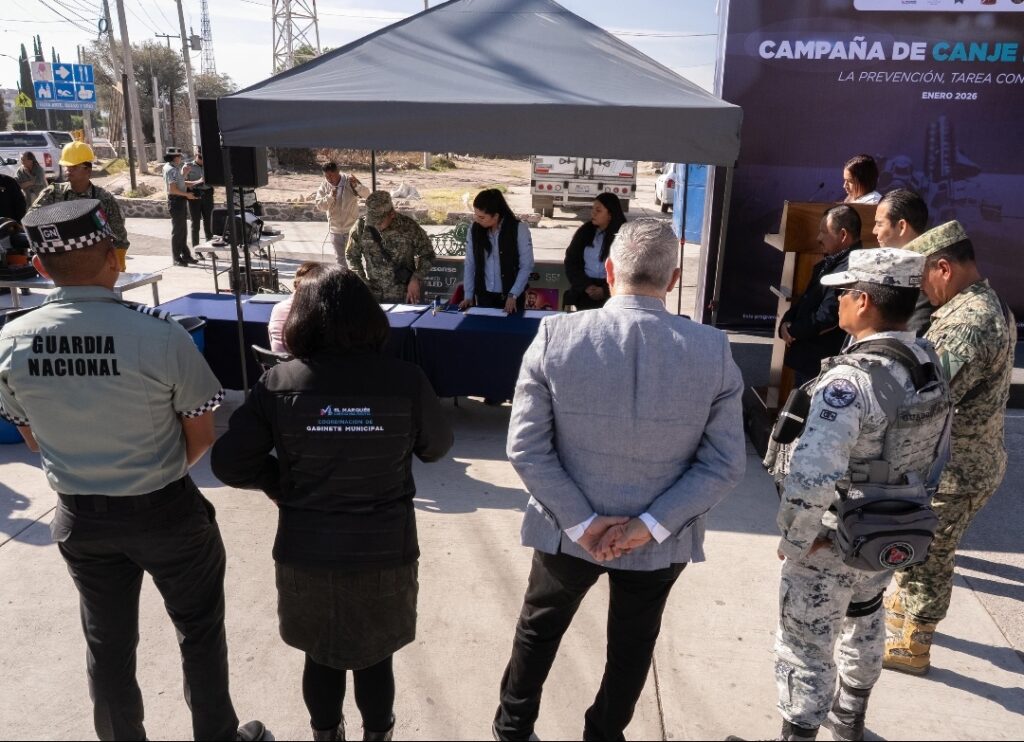 Al arranque del programa “Canje de Armas 2026” acudieron el Teniente Coronel José Ramón Pereyra Hernández, del 4º Regimiento de la 17ª Zona Militar; el Capitán Segundo de la Guardia Nacional, José Luis Cholula Esteban, perteneciente al 48 Batallón; el secretario de Seguridad Pública Municipal de El Marqués, Jorge Luis Barrera Rangel; el secretario de Gobierno de El Marqués, Alejandro Meré Montes, y el delegado de Chichimequillas, Guillermo Jaramillo Cruz.