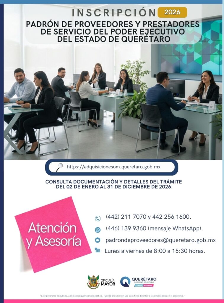 La Oficialía Mayor del Poder Ejecutivo del Estado de Querétaro, inicia este 2 de enero la inscripción al Padrón de Proveedores y Prestadores de Servicios 2026. El Padrón es un pilar fundamental en la estrategia del Poder Ejecutivo del Estado de Querétaro, encabezado por el Gobernador Mauricio Kuri González.