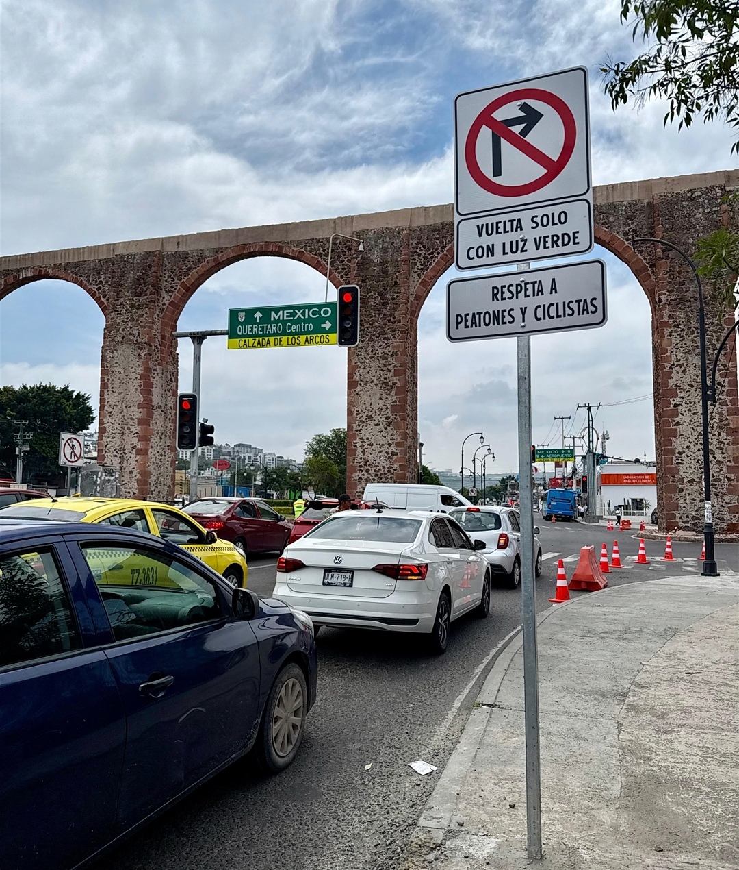 Previo a esta intervención se realizó la instalación de señalética vial para indicar que las vueltas de vehículos son permitidas únicamente con luz verde, de acuerdo al artículo 33 del Reglamento para la Movilidad y el Tránsito del Municipio de Querétaro.