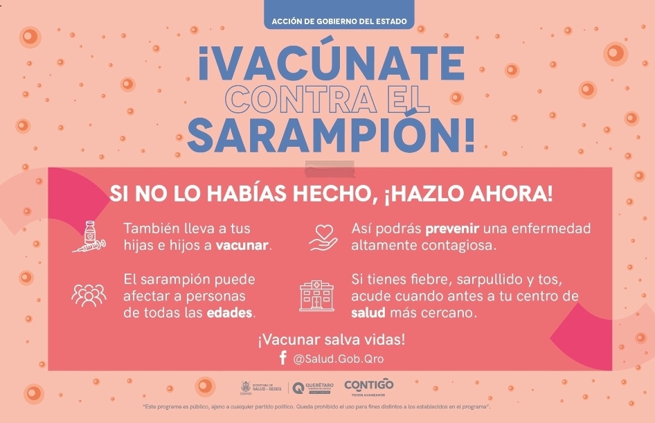 La Secretaría de Salud (SESA) del estado de Querétaro informa que, a partir de la detección del primer caso de sarampión registrado en el país en febrero de 2025, se reforzaron de manera inmediata y permanente las acciones de vigilancia epidemiológica, detección oportuna y jornadas de vacunación en todo el territorio nacional, con especial énfasis en la entidad.
