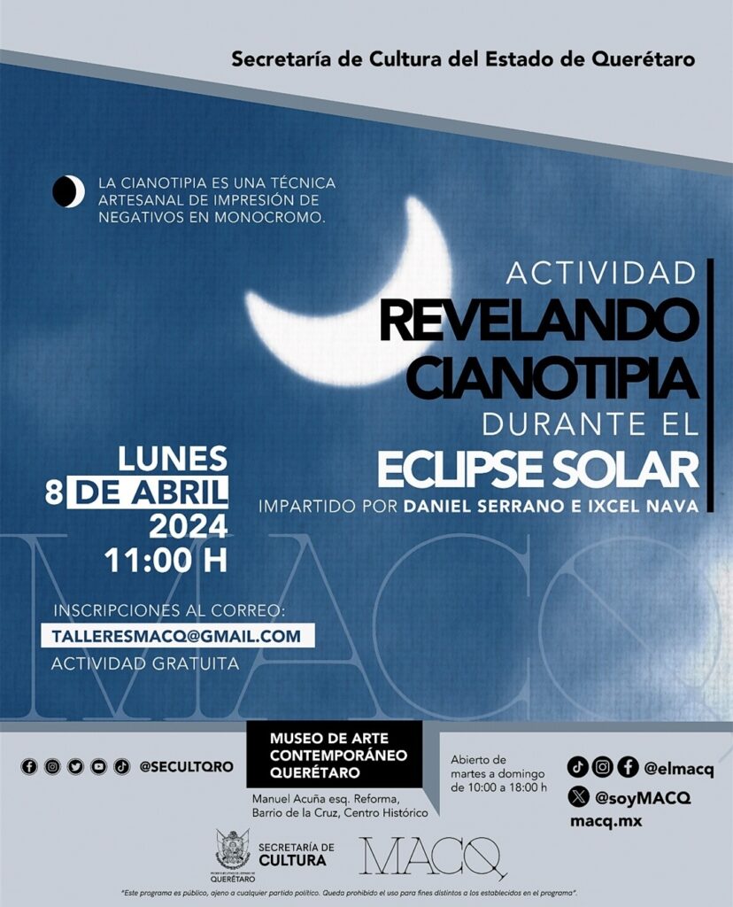 La cianotipia es una técnica de revelado e impresión de fotografías a través de la radiación ultravioleta, misma que es proporcionada por el sol; la intención es que el público se involucre en la actividad y en el proceso creativo, que adquiere un valor simbólico al ser realizado durante el eclipse, el cual se repetirá hasta dentro de 54 años; las y los interesados pueden inscribirse de manera gratuita en el correo talleresmacq@gmail.com