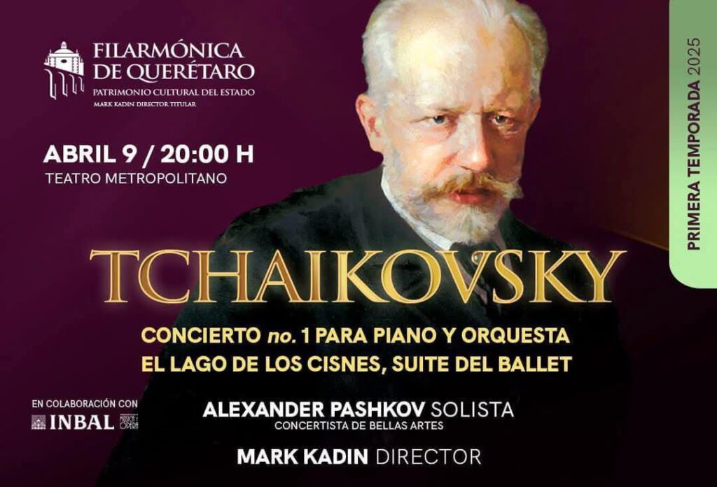 La Orquesta Filarmónica del Estado de Querétaro (OFEQ), bajo la dirección del maestro Mark Kadin, culminará su primera temporada de conciertos 2025 este 9 de abril, en el Teatro Metropolitano, con un programa que incluirá el Concierto para piano número 1 y la Suite del ballet «El lago de los cisnes» de Piotr Ilich Tchaikovsky, con la participación del pianista, Alexander Pashkov, como solista.