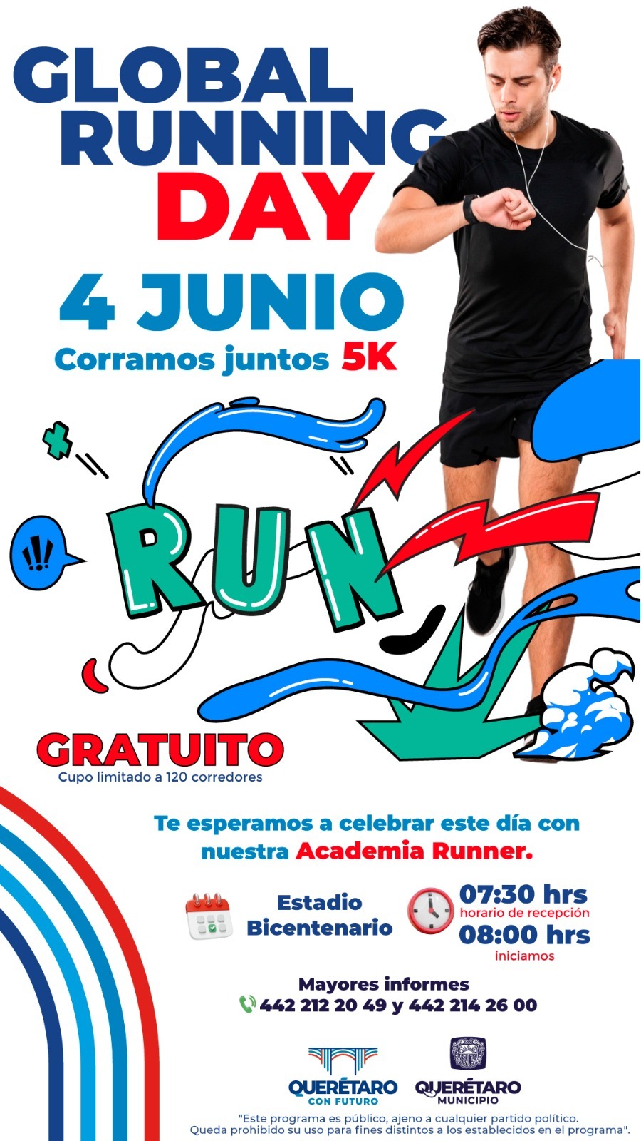 Con motivo del Global Running Day, el Municipio de Querétaro a través de la Academia Runner de la Secretaría del Deporte invita a todas y todos los corredores a participar en la carrera recreativa de 5 kilómetros, que se llevará a cabo este miércoles 4 de junio en el Estadio Bicentenario.