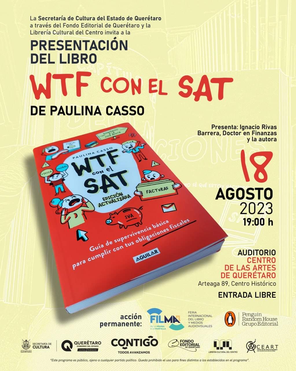 Como parte de una acción permanente de la Feria Internacional del Libro y Medios Audiovisuales (FILMAQ), la Secretaría de Cultura invita a la presentación del libro ‘WTF con el SAT’ de Paulina Casso, que se llevará a cabo este 18 de agosto a las 19:00 horas, en el auditorio del Centro de las Artes de Querétaro (CEART).