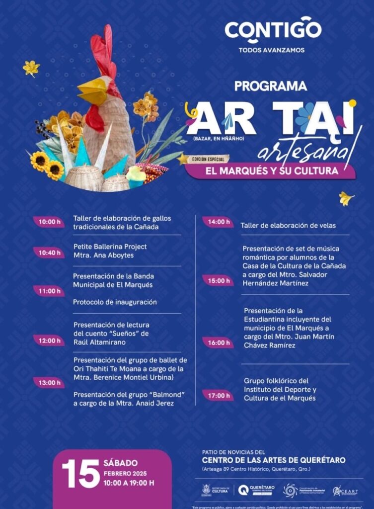 Este sábado 15 de febrero, en el Centro de las Artes de Querétaro (CEART), se llevará a cabo el primer Bazar Artesanal Ar Tai de 2025, con la participación de artesanas y artesanos de todo el estado, en esta ocasión dedicado al municipio de El Marqués.
