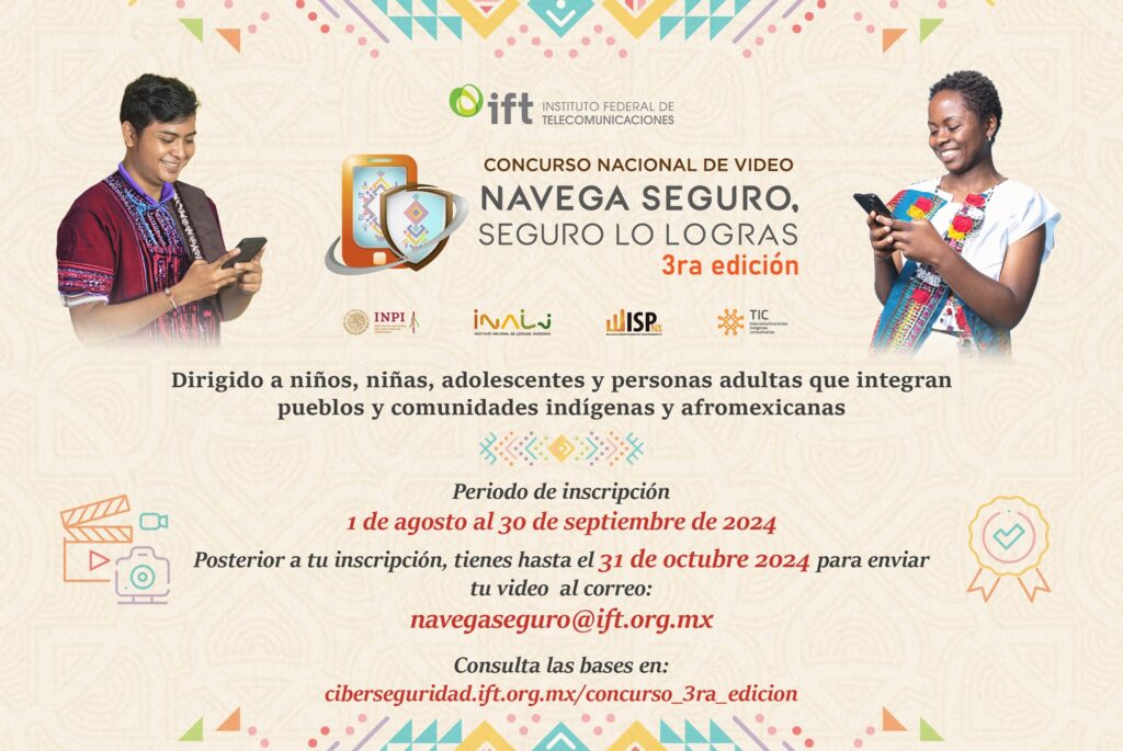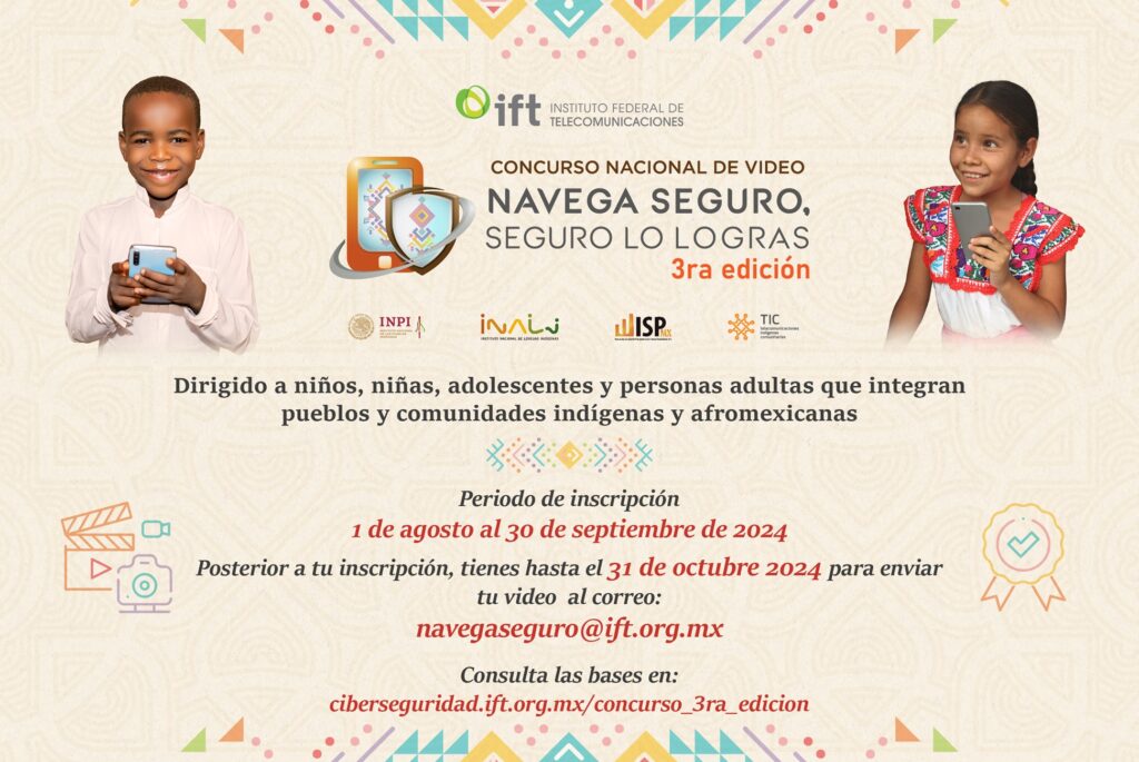 El concurso invita a niñas, niños, adolescentes, hombres y mujeres de 6 años, en adelante y sin límite de edad a desarrollar un video original de máximo dos minutos que promueva el acceso, la seguridad y confianza de las personas usuarias de Internet pertenecientes a pueblos y comunidades indígenas y afromexicanas a través del slogan “Navega seguro, seguro lo logras”.