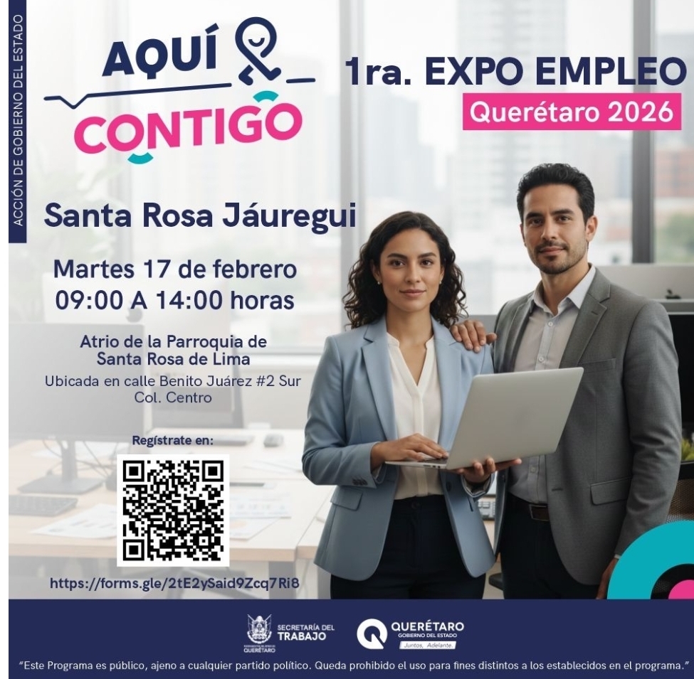 La Secretaría del Trabajo, a través del Centro de Empleabilidad, invita a la primera Expo Empleo Querétaro 2026, donde se ofertarán más de 800 vacantes en los sectores industrial y de servicios, con sueldos de hasta 50 mil pesos mensuales. El evento se realizará el martes 17 de febrero, de 9:00 a 14:00 horas, en el atrio de la iglesia de Santa Rosa Jáuregui, con la participación de más de 30 empresas como ABBOTT, Airbus Helicopters y JBT México, entre otras.