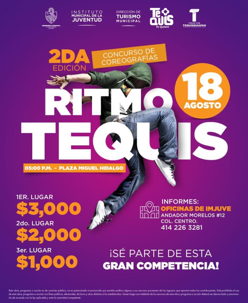El municipio de Tequisquiapan invita a los jóvenes de 12 a 29 años de edad a participar en la segunda edición del Concurso de Coreografías, que se realizará como parte del programa de actividades culturales y artísticas de las Fiestas del Pueblo, el domingo 18 de agosto a las 5:00 de la tarde en la Plaza Miguel Hidalgo.