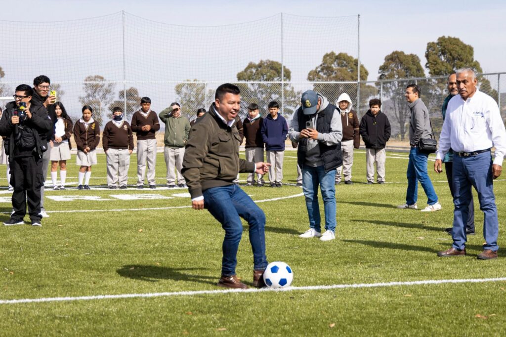 Durante la visita a la Escuela Secundaria Técnica No. 8 Jesús Romero Flores, ubicada en la comunidad de El Salto, se inauguró la rehabilitación y equipamiento de la cancha de futbol 7, obra realizada con una inversión de 3.4 millones de pesos, que beneficiará a cerca de 600 alumnas y alumnos, brindándoles un espacio digno para la práctica deportiva y la sana convivencia.