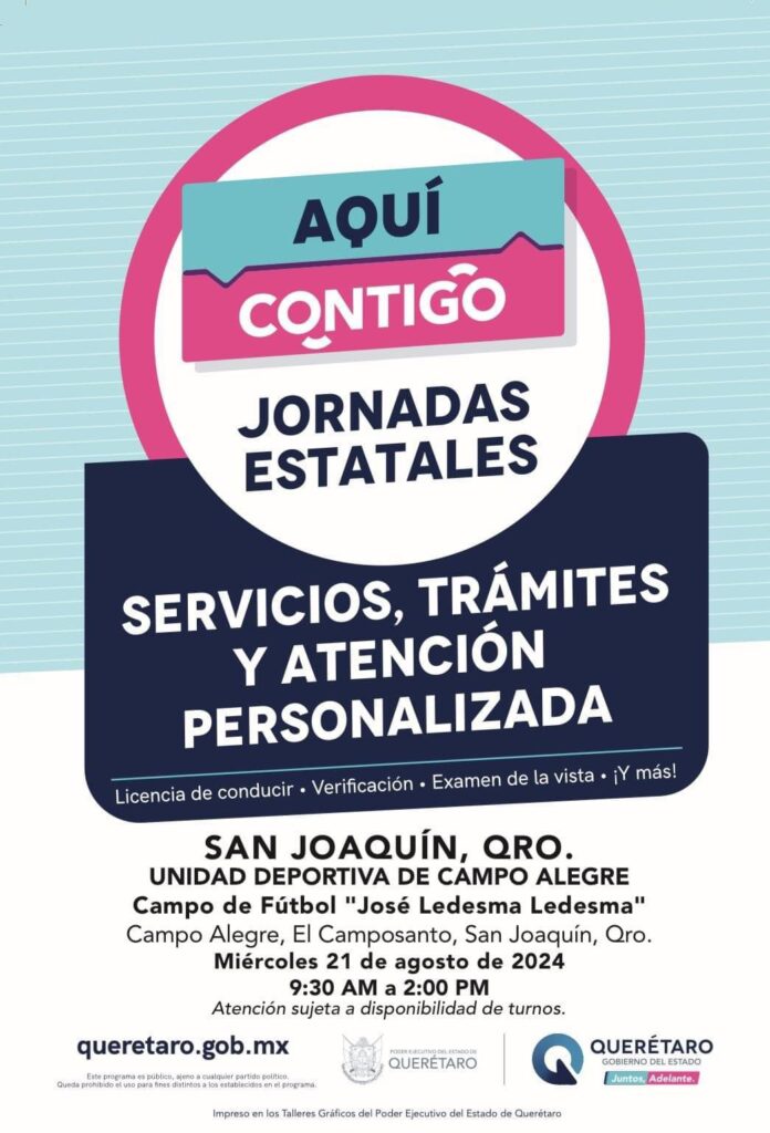 Municipio de SanJoaquin este Miércoles 21 de Agosto a las 9:30 hrs en la Unidad Deportiva de Campo Alegre llegan las jornadas estatales «Aquí Contigo»