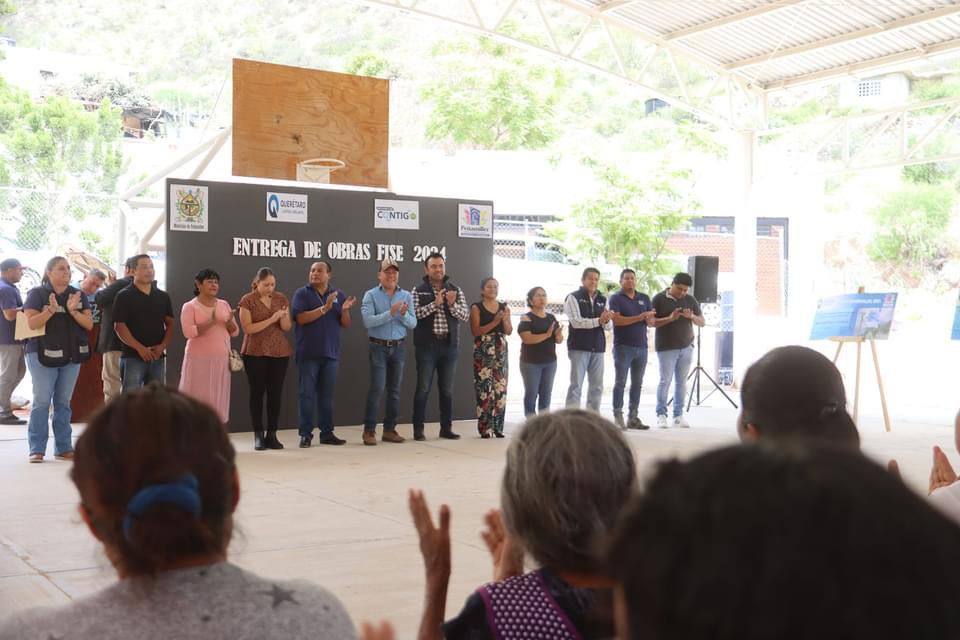 Juan Carlos Linares Aguilar Presidente Municipal, junto al Lic. Armando Vázquez Ramírez, Director de Desarrollo Comunitario de SEDESOQ, y el Lic. Roberto Villalvazo, coordinador del fondo FISE, así como Regidores, Directores de la Administración y comités de obra, entregan: