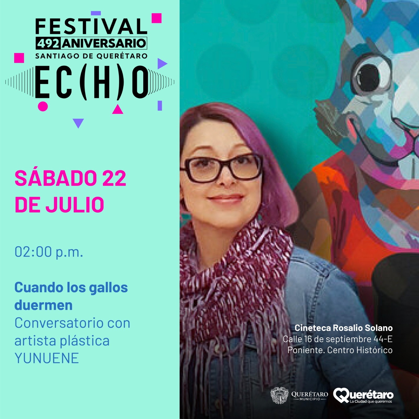 Asimismo, la artista YUNUENE participará en un conversatorio titulado «Cuando los gallos duermen» donde compartirá su trayectoria como artista plástica y hablará sobre el desarrollo creativo de la experiencia urbana de realidad aumentada llamada «Fiesta del Gallo». Este se llevará a cabo el sábado 22 de julio a las 14:00 horas en la Cineteca Rosalío Solano.