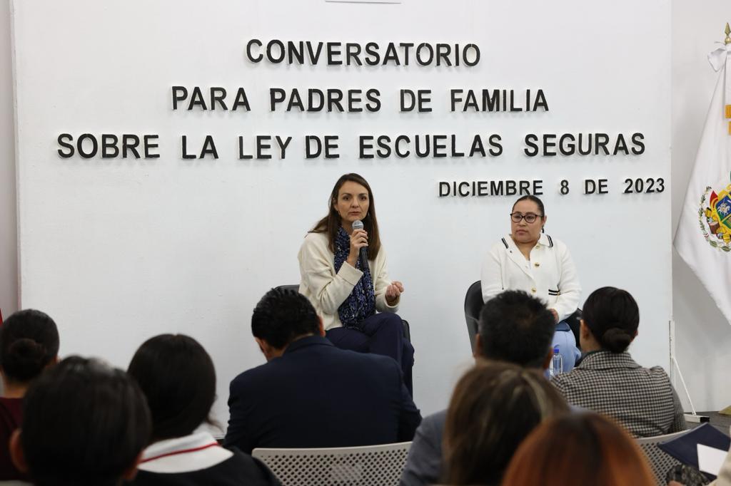 La presidenta de la Comisión de Educación y Cultura en la LX Legislatura, diputada Ana Paola López Birlain, en coordinación con la Asociación Estatal de Padres de Familia, representada por su presidenta, Zayim López Bustamante, llevaron a cabo un Conversatorio para Padres de Familia sobre la Ley de Escuelas Seguras, en el que, además, estuvieron presentes directores y profesores de educación básica.