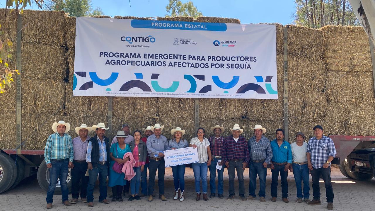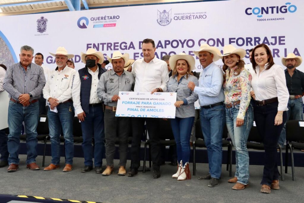en el municipio de Cadereyta, donde se dio inicio al programa de Apoyo con Forraje a Ganaderos del Estado Afectados por la Sequía. Este plan busca aliviar la difícil situación de más de cuatro mil productores pecuarios mediante la distribución de tres mil toneladas de forraje, mil 900 viajes de agua, y un suplemento alimenticio, con una inversión de 15 millones de pesos.