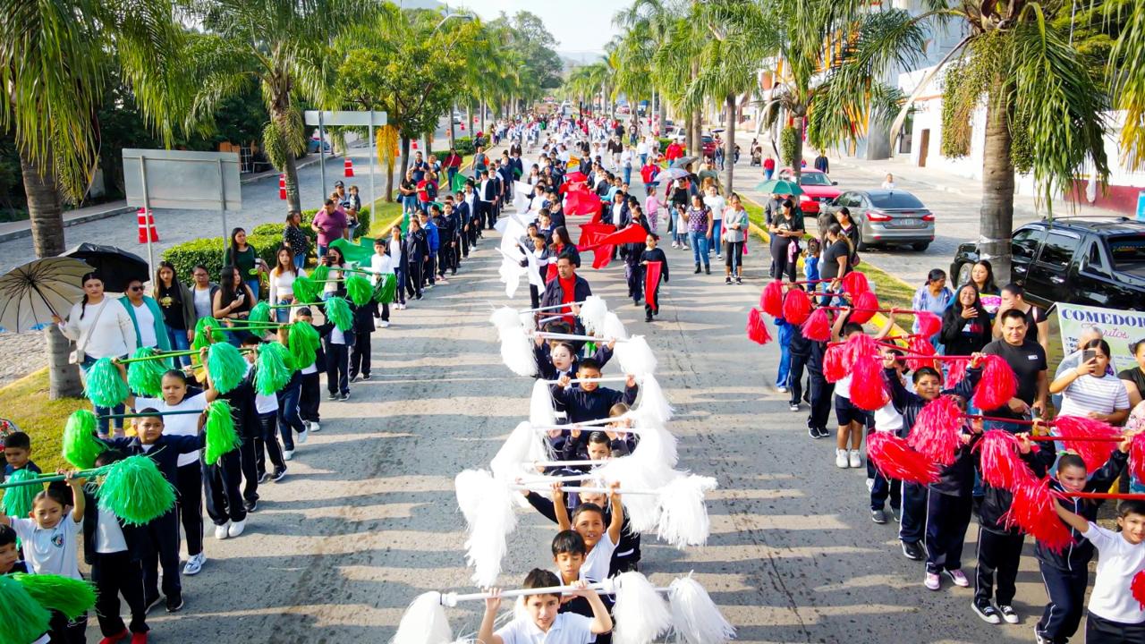 Durante el acto realizado en la Unidad Deportiva, la Presidenta Municipal agradeció a las escuelas, maestros y padres de familia por mantener vivos los valores cívicos, el amor por la historia y nuestra identidad entre las nuevas generaciones, así como por su esfuerzo y dedicación en la preparación del desfile.