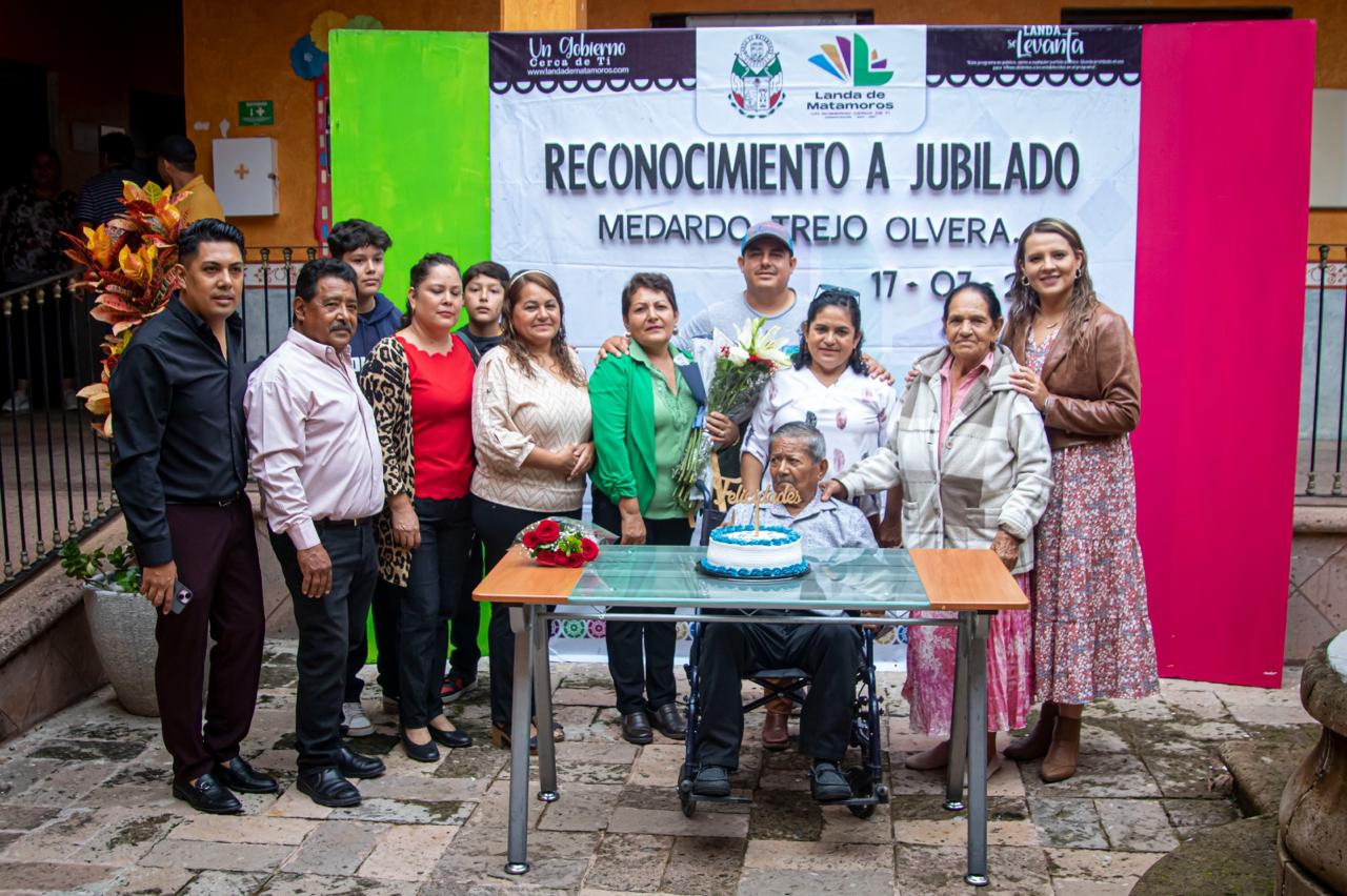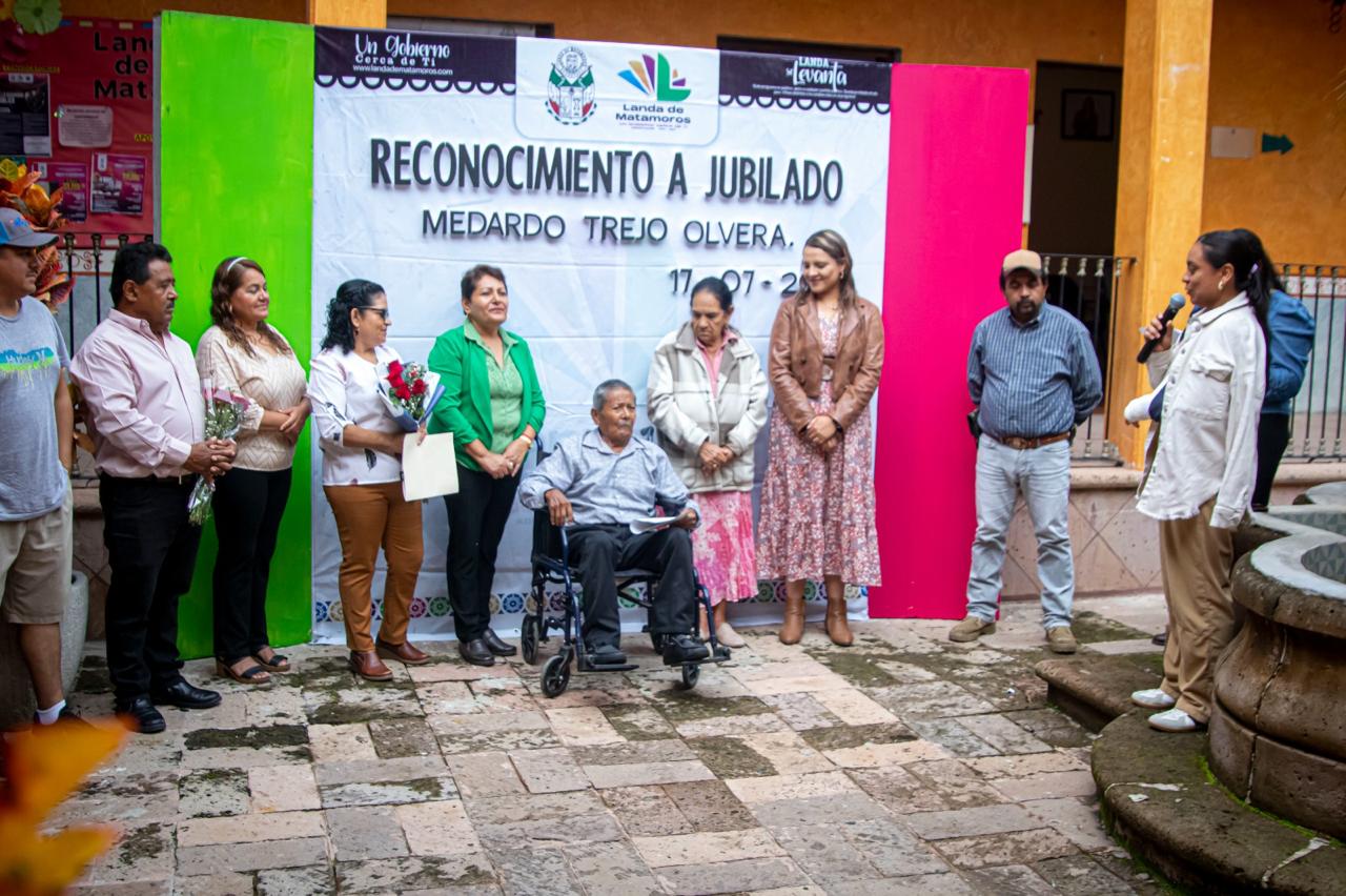 Con un emotivo acto protocolario, el Municipio de Landa de Matamoros reconoció la trayectoria del C. Medardo Trejo Olvera, quien se jubiló tras 30 años, 8 meses y 5 días de servicio comprometido al Ayuntamiento.