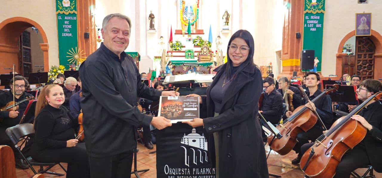 Al finalizar el concierto, y en representación de la alcaldesa, la Secretaria del Ayuntamiento, Anayeli García, entregó un reconocimiento a la Orquesta Filarmónica de Querétaro como muestra de agradecimiento por su visita y por compartir su arte con la comunidad landense.