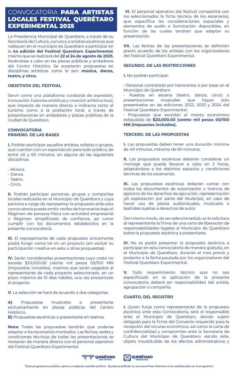 El Municipio de Querétaro, a través de la Secretaría de Cultura, convoca a artistas escénicos que radiquen en el municipio a participar en la 4ta edición del Festival Querétaro Experimental que se llevará a cabo del 21 al 24 de agosto de 2025, en plazas públicas y andadores del Centro Histórico.