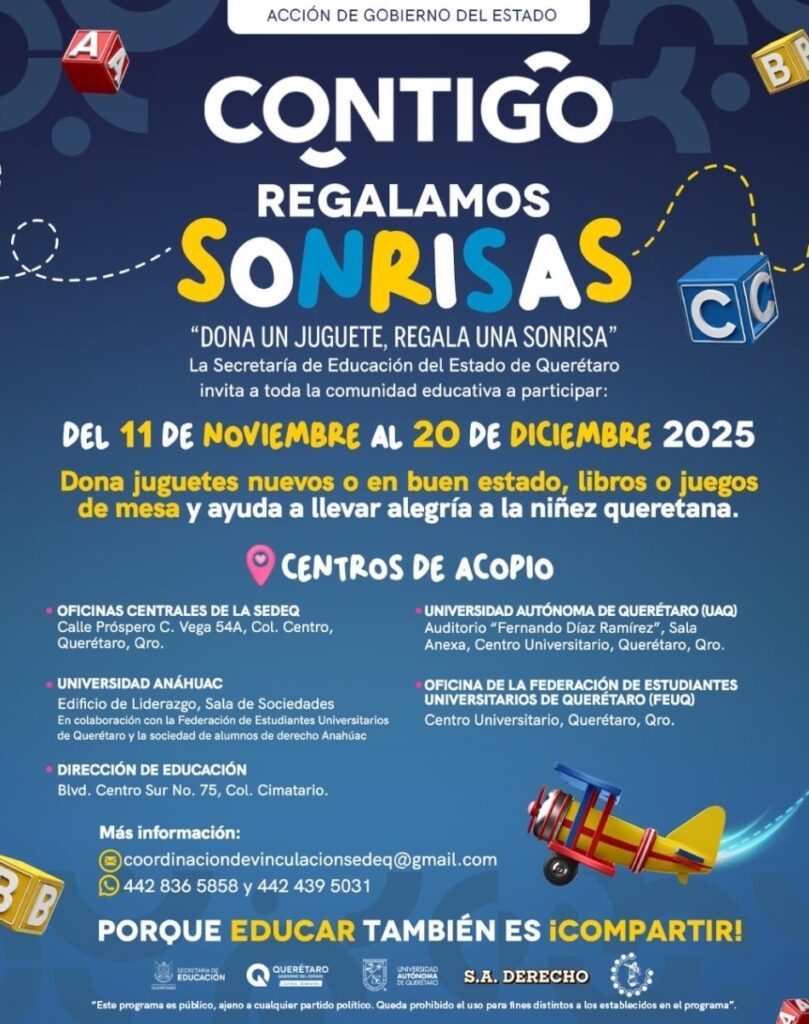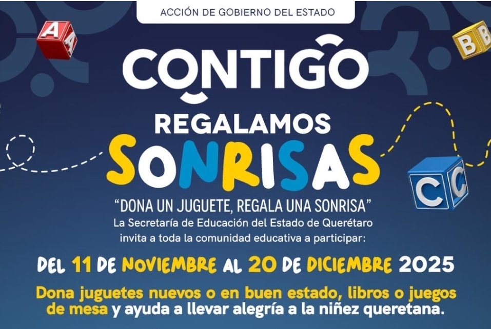 Con la finalidad de fomentar entre la comunidad educativa valores como la empatía, solidaridad y generosidad, la Secretaría de Educación del Estado de Querétaro (SEDEQ) lanza la colecta “Contigo Regalamos Sonrisas” para recaudar juguetes que serán donados a niñas y niños de diversos puntos del Estado.