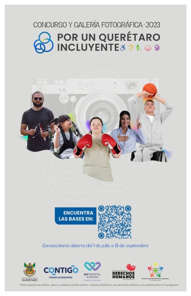 El Sistema Estatal DIF, la Red de Discapacidad del Estado de Querétaro y la Defensoría de los Derechos Humanos de Querétaro (DDHQ), emitieron la convocatoria al Concurso y Galería Fotográfica “Por un Querétaro Incluyente 2023”, en la que se invita a toda la sociedad queretana a participar en la construcción de una nueva visión de las personas con discapacidad.
