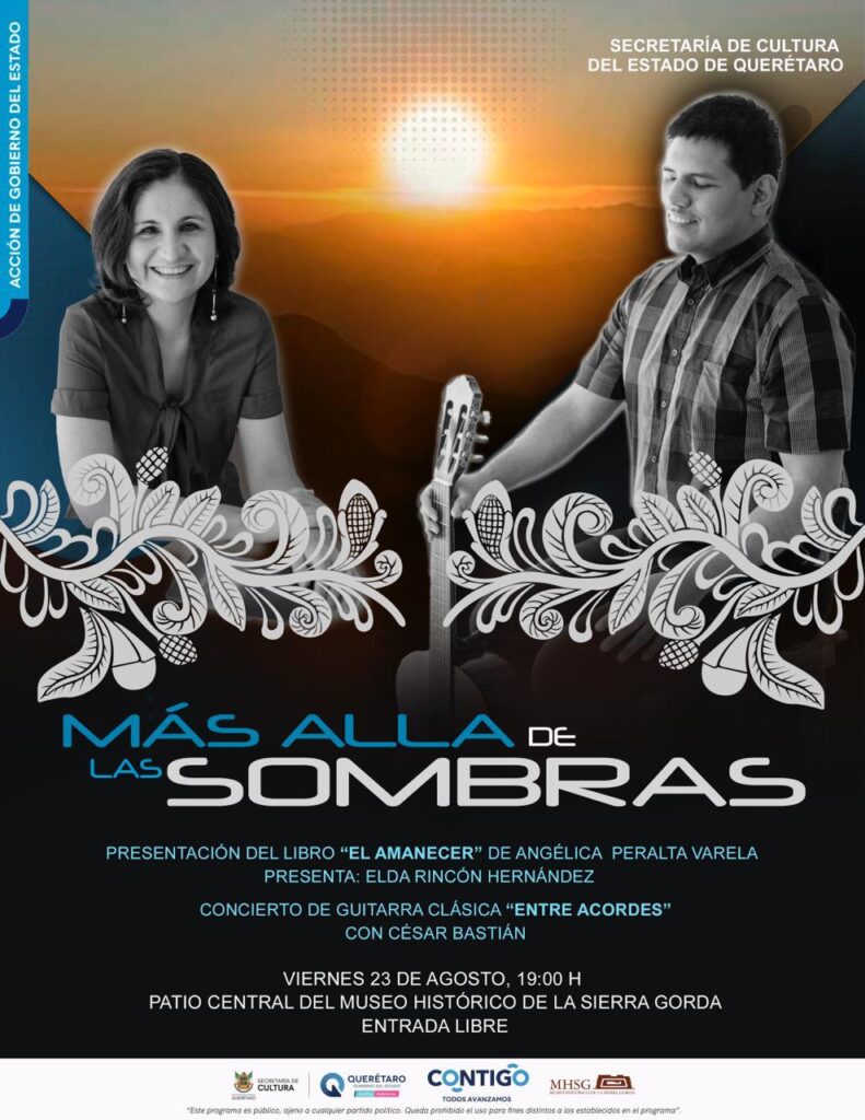 La música y la literatura llegan este viernes 23 de agosto al Museo Histórico de la Sierra Gorda, en el municipio de Jalpan de Serra, con la presentación del libro “El Amanecer”, de Angélica Peralta Varela, y el concierto de guitarra clásica “Entre acordes”, a cargo de César Bastian, artistas con discapacidad visual consolidados no sólo en el arte, sino también el ámbito académico profesional, pues ambos poseen la licenciatura en Derecho.
