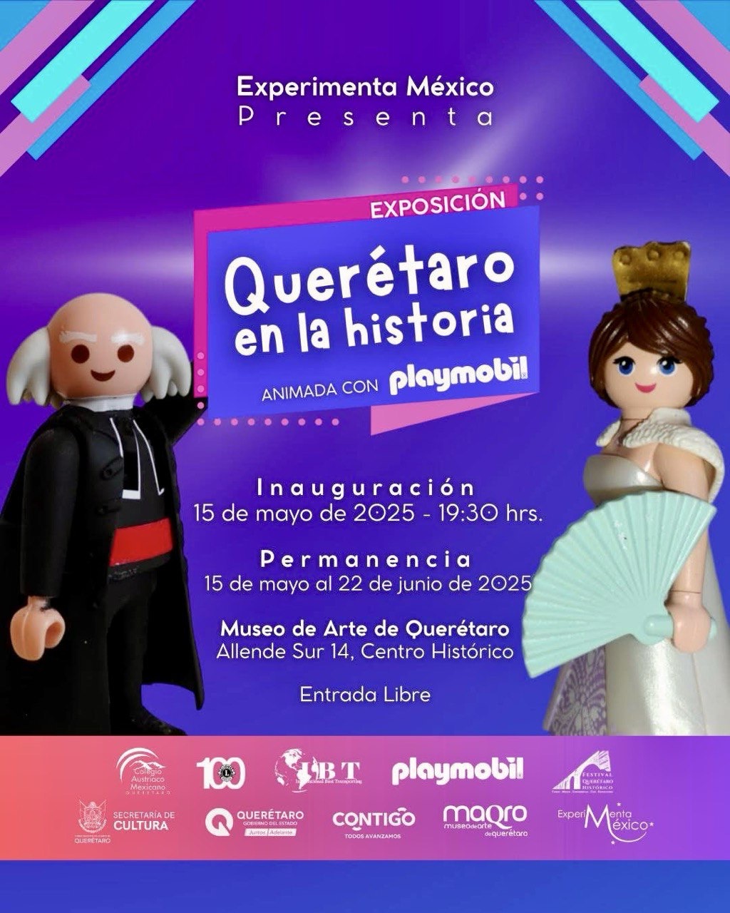 Este jueves 15 de mayo se inaugura en el Museo de Arte de Querétaro la exposición «Querétaro en la historia”, animada con Playmobil, una muestra didáctica conforma por mas de 350 figuras caracterizadas como diferentes personajes de la historia de México, creada y realizada por Jorge Flores con la colaboración de Víctor Manuel Contreras y presentada por Experimenta México.