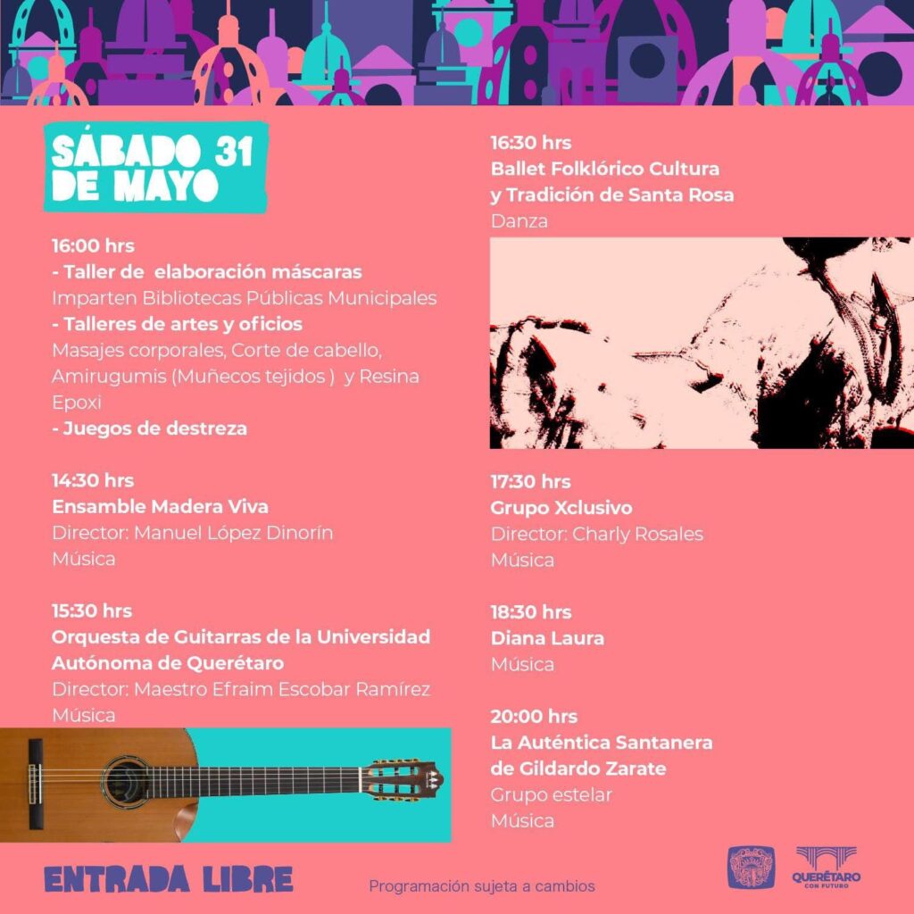 El sábado el festival arranca a las 16:00 hrs. con talleres de elaboración de máscaras, talleres de Artes y Oficios y Juegos de destreza, a las 14:30 hrs. se presenta el Ensamble Madera Viva – Dir. Manuel López Dinorin, a las 15:30 hrs. la Orquesta de Guitarras de la Universidad Autónoma de Querétaro, a las 16:30 hrs. el Ballet Folklórico Cultura y Tradición Santa Rosa, a las 17:30 hrs. el Grupo Xclusivo – Dir. Charly Rosales, mientras que a las 18:30 hrs. contaremos con la presentación de la cantante Diana Laura y para cerrar con broche de oro y como artista estelar el Santa Rosa Fest concluye con la presentación de La Autentica Santanera de Gildardo Zarate a las 20:00 hrs.