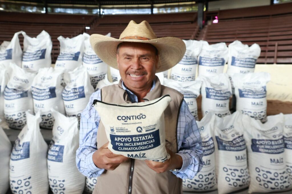 El secretario de Desarrollo Agropecuario, Rosendo Anaya, encabezó la entrega de apoyos consistentes en más de 449 toneladas de maíz para consumo humano, en el municipio de Querétaro, acción que respalda el trabajo de mil 274 productores y sus familias, que sufrieron afectación en dos mil 992 hectáreas de siembra de temporal en la región y que vieron mermada su cosecha por las inclemencias climatológicas.