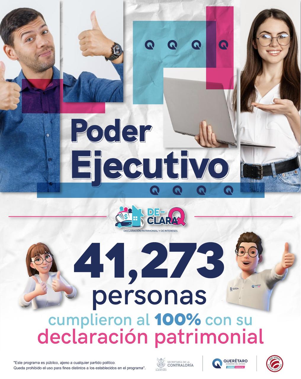 Desglosando la información, detalló que fueron 63 mil 234 las servidoras y servidores públicos de los tres poderes, así como de los 18 municipios y los pertenecientes a organismos autónomos quienes cumplieron con esta obligación. Del total, 41 mil 273 son trabajadores que forman parte del Poder Ejecutivo del Estado de Querétaro.