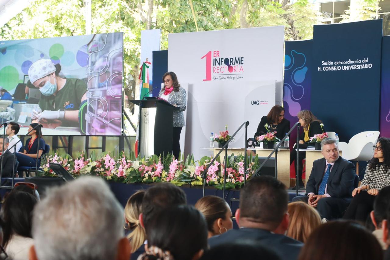 Durante la presentación, la Dra. Amaya Llano expuso los avances y retos enfrentados por la Universidad Autónoma de Querétaro, destacando proyectos estratégicos para mejorar la calidad educativa y fomentar el bien de la comunidad estudiantil.