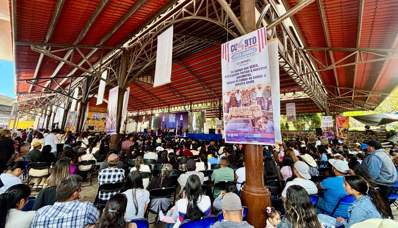 La Presidenta Municipal de Pinal de Amoles, Lupita Ramírez Plaza en compañía de su esposo, el Ing. Iván Zárate, y del Secretario de Desarrollo Sustentable del Estado, Marco del Prete Tercero, en representación del gobernador Mauricio Kuri; presentó su 4to Informe de Gobierno ante la ciudadanía pinalense.