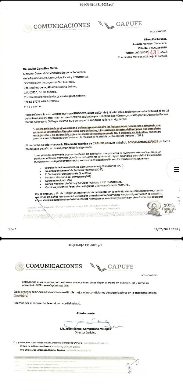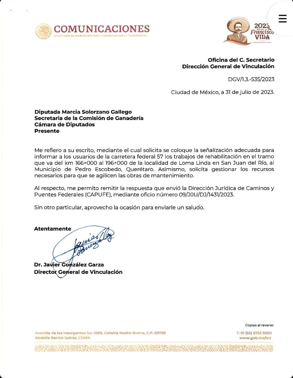 El oficio de la petición fue entregado el mes anterior y la respuesta se recibió el 1 de agosto, por lo que la diputada Marcia Solórzano reiteró que su trabajo ha sido permanente para agilizar la rehabilitación de la carretera México Querétaro, al destacar que se han presentado una serie de exhortos y solicitudes en este sentido.