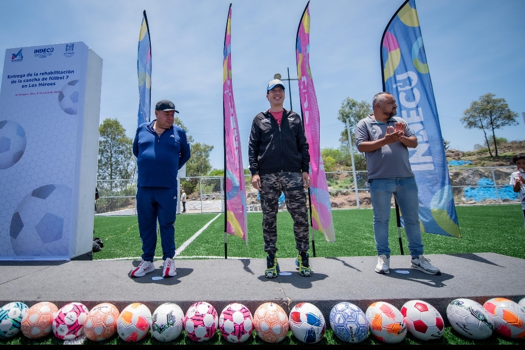 El presidente municipal de El Marqués, Rodrigo Monsalvo Castelán, encabezó la entrega de rehabilitación de la cancha de futbol siete ubicada en el Fraccionamiento Los Héroes, misma que beneficiará, directamente, a las y los habitantes de la zona, así como a 45 equipos que utilizan estas instalaciones.