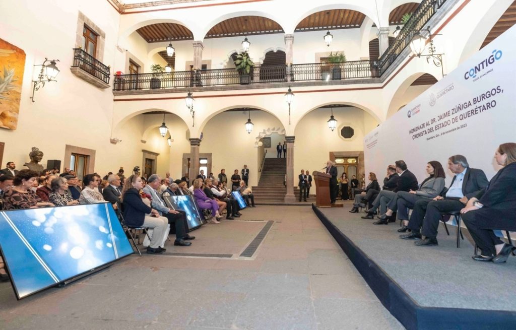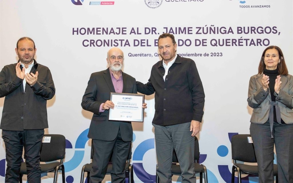 El gobernador, Mauricio Kuri González, encabezó un homenaje al Cronista del estado, Jaime Zúñiga Burgos, por su labor, legado y trayectoria para preservar la historia de Querétaro; además, reconoció sus aportes en materia cultural, política, de medicina e inclusive de derecho, lo cual dijo, ha fortalecido y enriquecido el patrimonio histórico de la entidad.