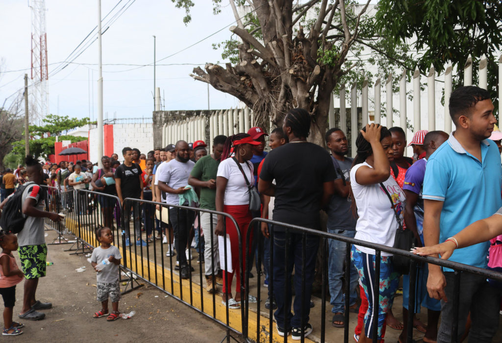 MEX9398. TAPACHULA (MÉXICO), 04/07/2023.- Decenas de migrantes hacen fila para regular su situación migratoria hoy, en Tapachula (México). Activistas mexicanos y migrantes advirtieron este martes de una nueva ola migratoria que llega a la frontera sur de México desde distintos países, en particular de Cuba, con la meta de llegar a Estados Unidos a pesar de las mayores restricciones desde el fin del Título 42. EFE/Juan Manuel Blanco