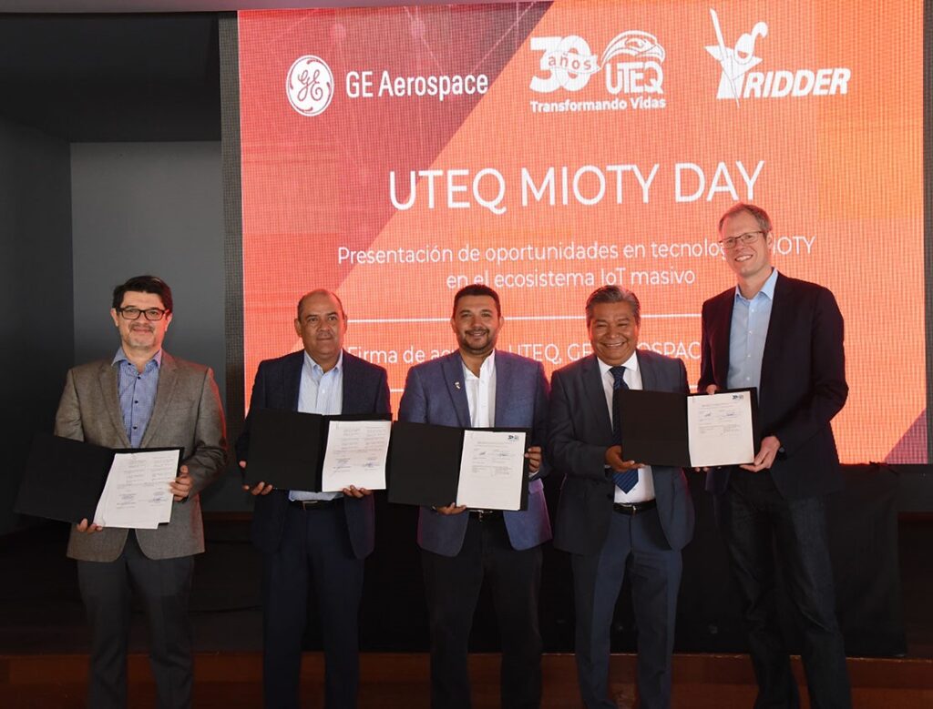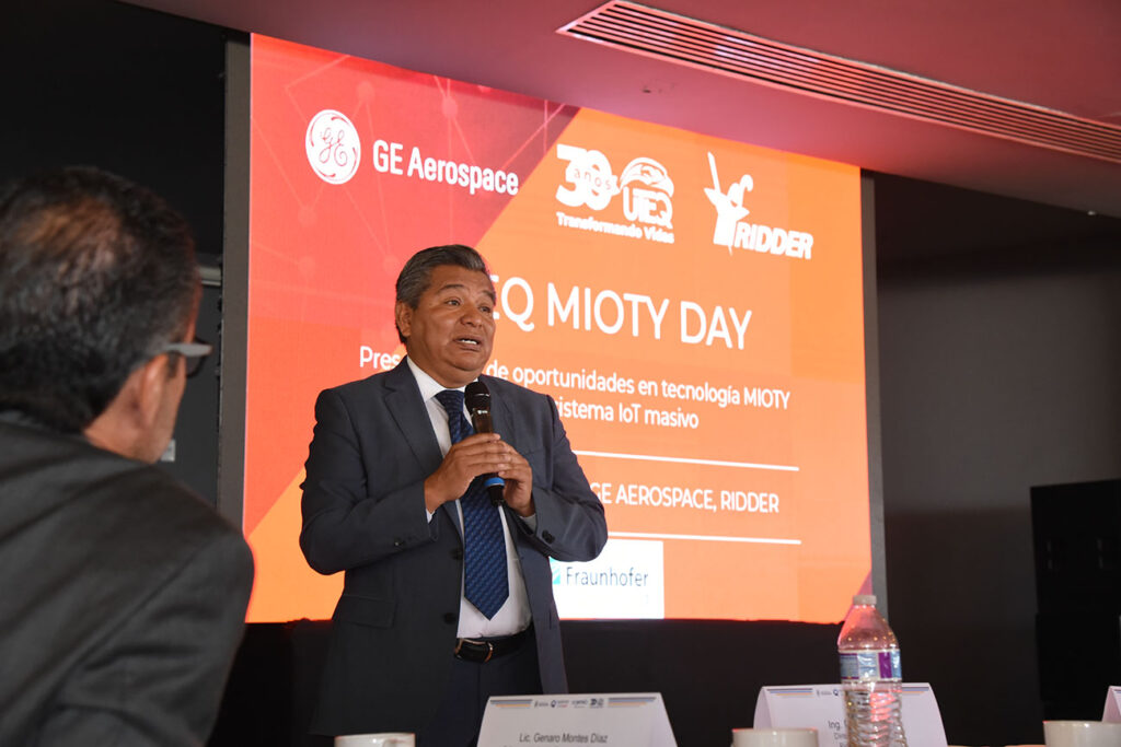 El rector de la Universidad Tecnológica de Querétaro, José Carlos Arredondo Velázquez, encabezó la presentación de oportunidades que ofrece para la industria la Tecnología Mioty en el ecosistema IoT (Internet de las cosas por sus siglas en inglés), así como la firma de acuerdos con las empresas GE Aerospace y RIDDER para impulsar soluciones de vanguardia en el sector aeroespacial y agroindustrial.