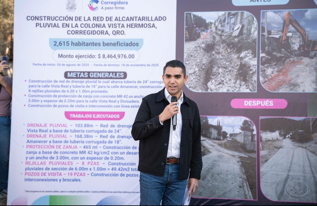 El jefe de Gabinete Municipal de Corregidora, Carlos Contreras, en representación del alcalde Chepe Guerrero, inauguró la red de alcantarillado pluvial en la colonia Vista Hermosa, la cual beneficia a más de 2 mil 600 habitantes de la zona, gracias a una inversión de 8.5 millones de pesos.