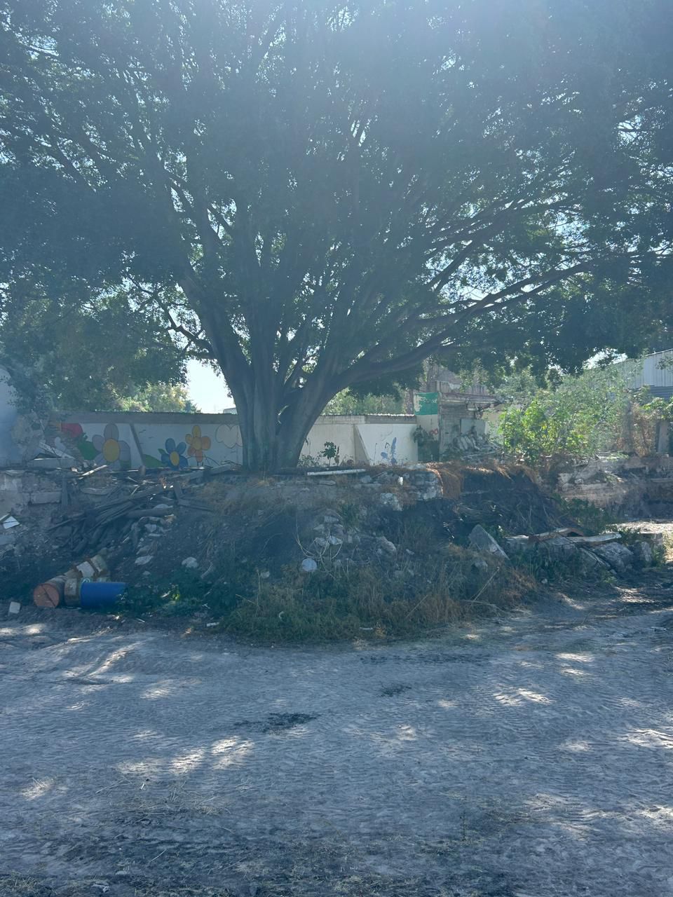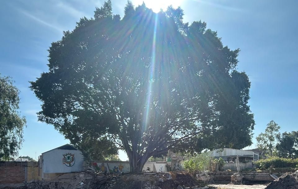 Se verificó que en el terreno se localiza un laurel de la India con una altura aproximada de 30 metros y no se detectaron daños visibles al árbol ni cortes en sus raíces. Sin embargo, se observó material de obra acumulado en el área que rodea su base, así como trabajos de excavación y limpieza en el resto del predio, además de maquinaria detenida en el lugar.