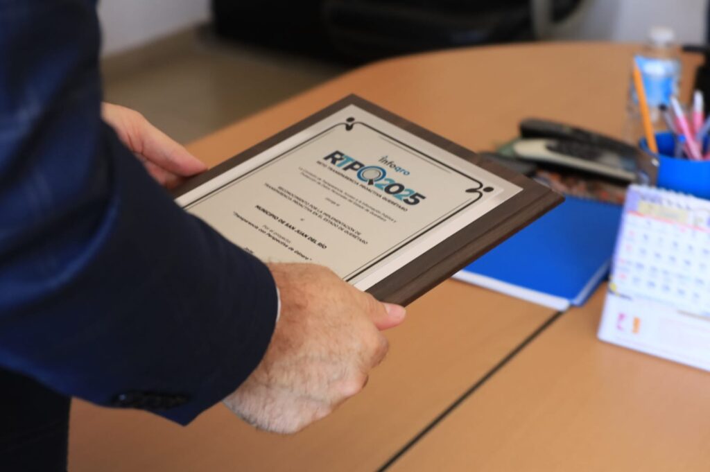 - El reconocimiento fue entregado al alcalde Roberto Cabrera Valencia, por el comisionado presidente de INFOQRO, Javier Marra Olea, en las instalaciones de Centro Cívico.
