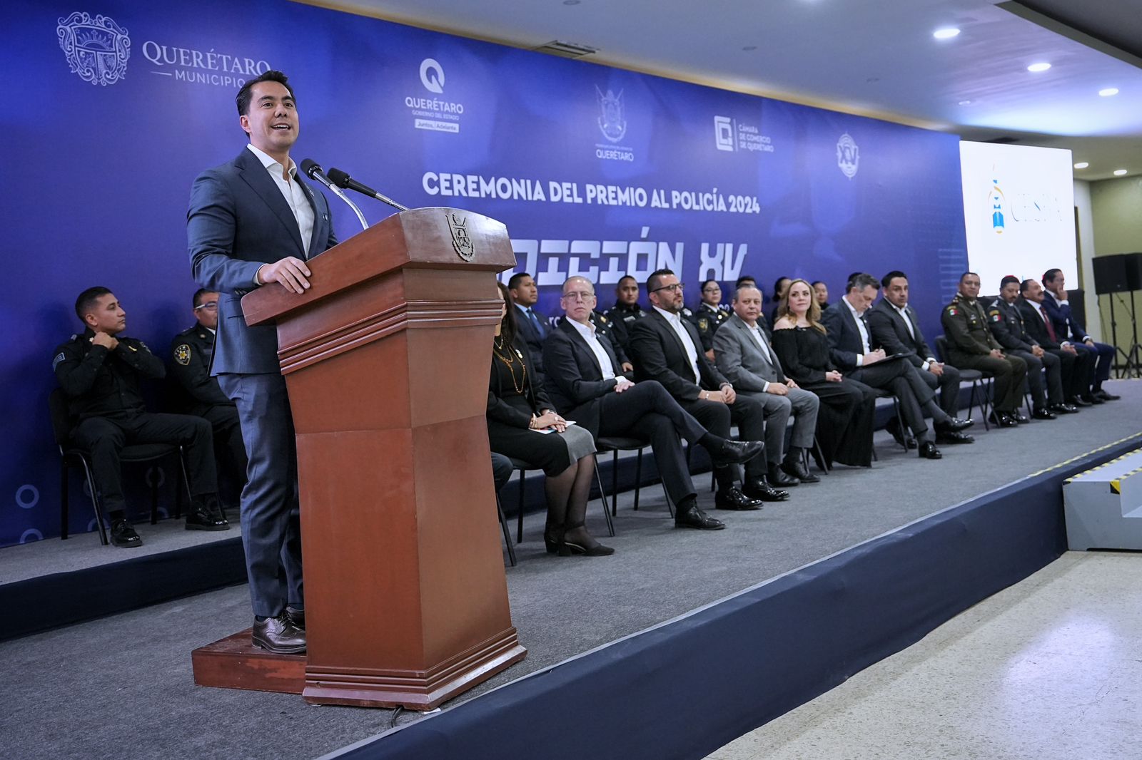 El presidente municipal, Felifer Macías, participó junto al gobernador del Estado, Mauricio Kuri González, en la ceremonia de premiación del Policía del Año 2024, en su XV Edición, donde la Cámara Nacional de Comercio, Servicios y Turismo (CANACO) Querétaro otorgó el cuarto lugar al policía primero Eduardo Lara Jaime y el quinto lugar al policía tercero Juan Carlos Martínez Hernández, ambos integrantes de la Secretaría de Seguridad Pública Municipal de Querétaro.